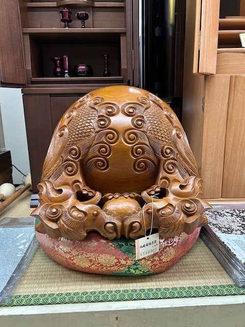 当店では、寺院で実際に用いられている仏具を取り揃えており、鏧子(けいす)と呼ばれる大きなおりん、小さな木魚から大きな木魚など、実物をたたいて音色をお確かめいただけます。